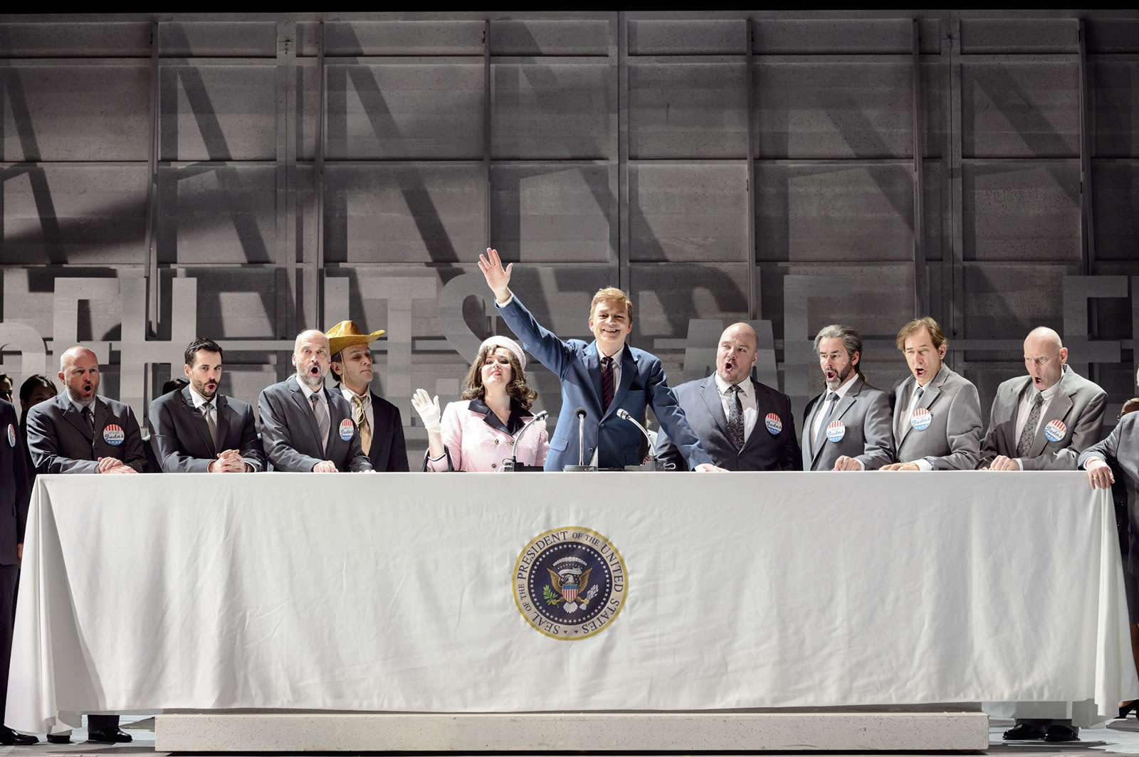 Kate Allen als Jackie, Alejandro Marco-Buhrmester als JFK, Opernchor des Staatstheaters Augsburg. Foto: Jan-Pieter Fuhr