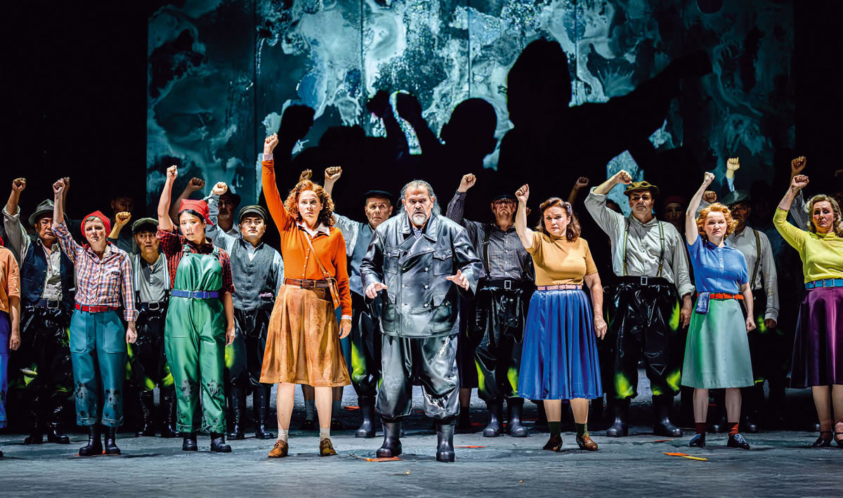 Frank Hilbrich schweißt in seiner sowohl brennspiegelartigen wie verallgemeinernden Inszenierung den Chor zu einem flackernden und düster resignierenden Kollektiv zusammen. Raue, böse und gute Momente versetzt der designierte Intendant des Musiktheaters im Revier Gelsenkirchen in monumentale Spannung und macht sie damit beeindruckender, als sie unter mimischem Überdruck wirken würden. Vor einem Brand mit mehreren Todesopfern kommt es sogar zu einem romantisch suggestiven Untertage-Tableau. Die untergegangene DDR ersteht im verminten Spannungsfeld zwischen einer verlorenen Vergangenheit und abrupten Wechselstößen aus Solidarität, Spaltung und Gewalt von oben. Instrumentale Begleitformeln von suggestivem und mysteriösem Wohlklang, gleißende Akzente und Harmonien begleiten das kollektive Schicksal.