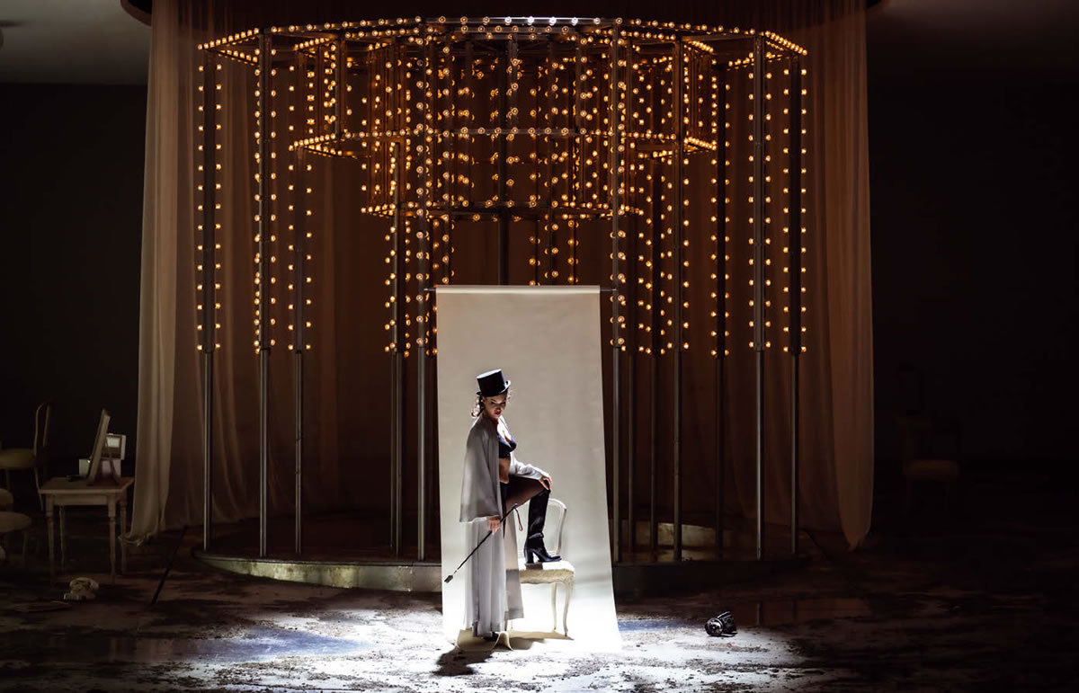 Da erscheint sie wie Marlene Dietrich in „Der Blaue Engel“ im engen Frackoberteil mit langen nackten Beinen. Der Bruder schießt Pin-up-Fotos von ihr, und das kokette Girl posiert vor Gästen des Sugar Daddy gelangweilt-lasziv an den Stangen des vormaligen Karussells. Im dritten Akt werden die Stangen zum Gefängnis, in dem die Betrügerin und Schmuckräuberin landet, um nach Amerika verschickt zu werden. Dort stirbt Manon schließlich in menschenfeindlicher Wüste auf den Trümmern ihres zerbrochenen Lebenskarussells. Wie ihre erste Arie wird ihr letzter Sterbegesang ganz schlicht von einer Soloflöte begleitet. Die zarte Erinnerung an verlorene Unschuld und an den Anfang der Tragödie tönt von fern jenseits des Orchesters.
