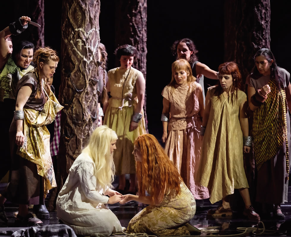 Elfrida Andrée, „Die Fritjof-Saga“ mit Deirdre Angenent (Guatemi) und Ann-Kathrin Niemczyk (Ingeborg) im Vordergrund und dahinter Almerija Delic (eine alte Frau), Elena Sverdiolait (zweite Frau), Idil Kutay (dritte Frau), Liliana de Sousa (erste Frau) und Damenchor des Aalto-Theaters Essen. Foto: Matthias Jung