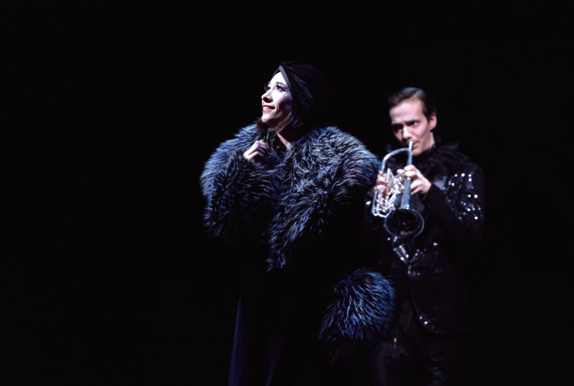 Arshak Ghalumyan, „Pulcinella“ mit Jéssyca Helena Rett als Yvonne Georgi und Trompeter Sami Lab. Foto: Ronny Ristok